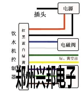 紅線----->12V電源正極,黑線----->12V電源負極,藍線----->電磁閥一端,白線----->電磁閥另一端,綠線、黃線空出,紫線----->流量計負極,淺綠線----->流量計信號線,棕線----->流量計正極。