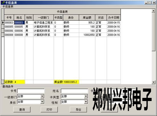 卡信息表主要用于查看卡的基本信息。可以選擇相應(yīng)的條件,然后單擊【查詢】在表格中會出現(xiàn)相應(yīng)條件的卡的基本信息,表的最下面顯示出所查詢出的總記錄數(shù)及庫金額匯總。