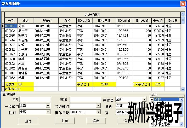 2、要是想要知道操作員收入和支出的名細(xì),就要在資金明細(xì)表里查看的。數(shù)據(jù)管理--資金明細(xì)表。這里可以選擇存款,取款,開戶,退款都可以查到。
