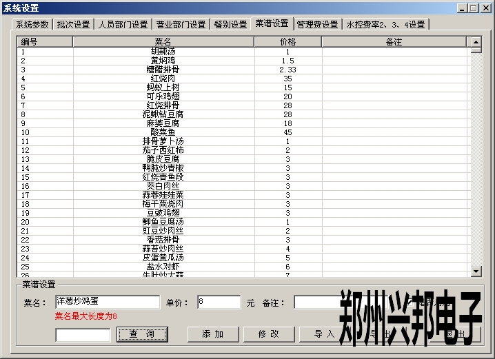 添加菜單時,輸入菜名、單價、備注(可填可不填)、選擇是否啟用,然后點擊添加即可。添加后可修改、導入、導出菜名、單價等信息,最多可添加2000個菜單,菜單添加后不能刪除,可以選擇是否啟用。菜名最大為8個漢字,可以為漢字、數字、字母或者特殊字符。
