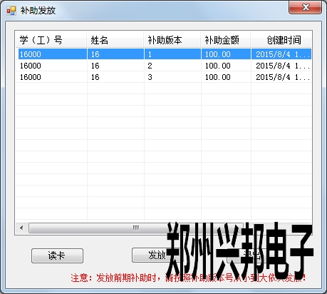 ? 首先點擊讀卡,讀卡后會按補助的版本號顯示出這張卡所有未領取的補助,領取過的不顯示,發放補助時,按照補助的版本號從小到大依次發放,發放的時候選中要發放的補助,然后點擊發放即可。