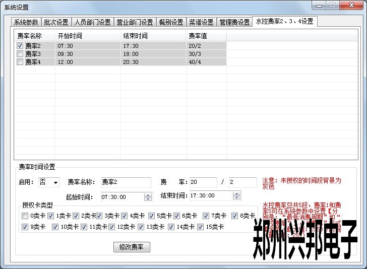 互聯網平臺IC卡水控機具備多費率扣費功能,不同卡類型的卡片可以按不同的費率扣費,甚至免費使用,費率最多可以設置5個費率,分別是費率1(最低消費周期,分卡類型)、費率2(時間段費率,分卡類型)、費率3(時間段費率,分卡類型)、費率4(時間段費率,分卡類型)、費率5(不分卡類型),該設置可以通過制作管理卡或者下載系統參數下載到水控機中。