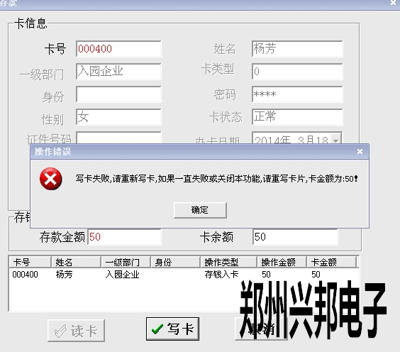 客戶在使用我們的局域網一卡通存款時出現:寫卡失敗,請重新寫卡,如果一直失敗或關閉本功能,請重寫卡片,卡金額為50!
