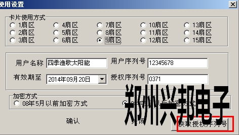 2.雙擊后出現(xiàn)下圖所示的界面,點(diǎn)擊該界面右下角的【獲取授權(quán)序列號(hào)】按鈕,即可讀出當(dāng)前數(shù)據(jù)庫中的設(shè)置,包括 使用扇區(qū)、用戶名稱、用戶序列號(hào)、授權(quán)序列號(hào)、加密方式
