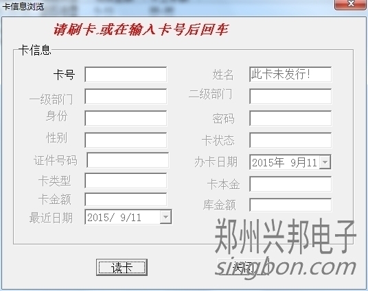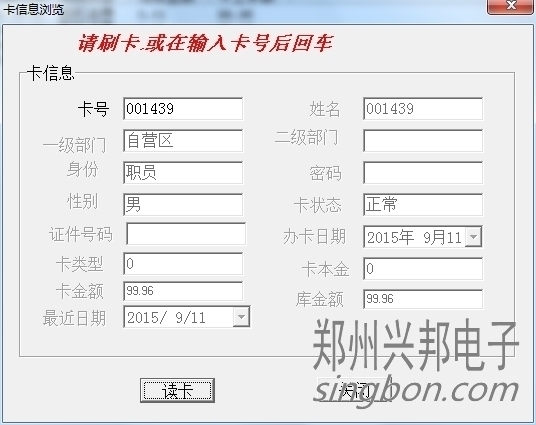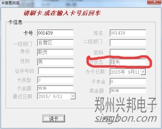 卡片就上面三種狀態,另外一些操作,會造成卡狀態改變,比如:掛失的卡解掛,就變成消費卡;掛失的卡補辦新卡,掛失卡就會變成新卡;消費卡被收繳舊卡就變成新卡。新卡在消費機上刷卡會顯示1-Err,消費卡會顯示金額,掛失卡會顯示4-Err。