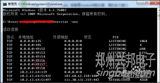 輸入命令:netstat -ano,列出所有端口的情況。在列表中我們觀察被占用的端口,比如是49157,首先找到它