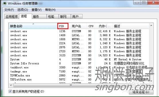 則我們點擊查看--->選擇列,將PID(進程標示符)前面的勾打上,點擊確定
